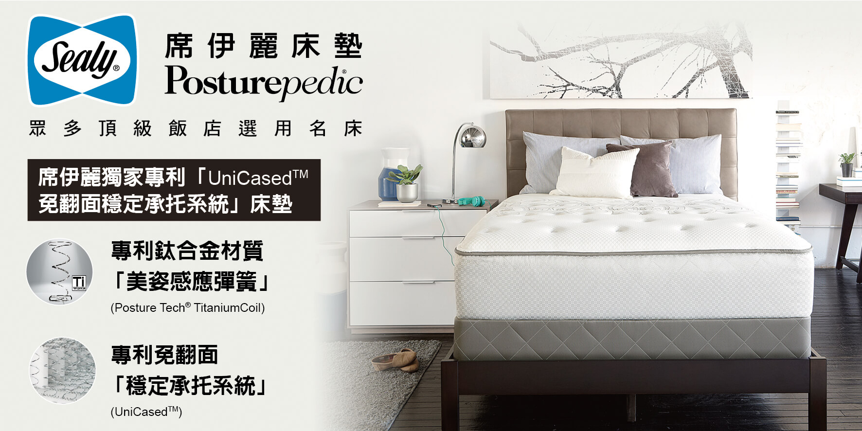 1881年創立於德州Sealy小鎮。1949年,與骨科權威Dr. R. G. Addison與頂尖矯形外科醫師顧問團共同研發出獨特的專利『美姿感應彈簧』,其特別的『感應力臂』能感應人體重量及動作,作出相應調節,使睡眠者的骨架自然平直,作出最佳貼身承托,擁有一夜好眠。