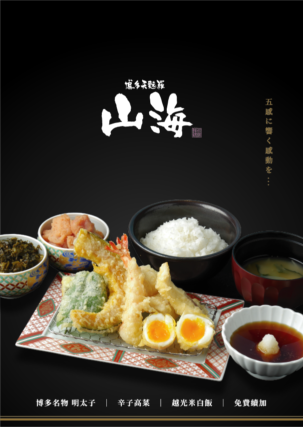 博多天麩羅山海源自於日本九州,特色是提供熱騰騰、現炸酥脆的天婦羅,附上特有的飛魚高湯加上鰹魚之濃厚的醬汁,加上使用新鮮季節感的食材,讓每一口體現脆脆口感和品嚐出食材本身的原有風味,是從味道至外觀都有徹底講究的天婦羅專賣店。 秉持對料理品質的堅持,特地使用九州名物博多織裝潢的店內,還可以享用道地明太子,辛子高菜以及白飯無限量供應。