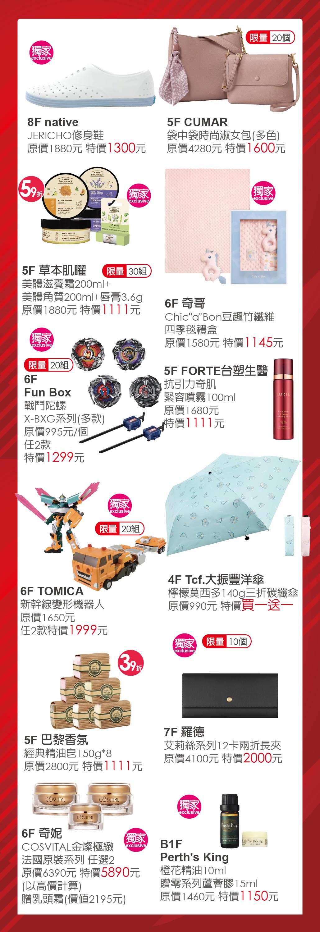 1F (Venchi除外)、2F 10/10 APOTHECARY、Acqua di Parma、COACH、CREED 、DEVIALET、Diptyque、H&M、LOEWE Perfumes、lululemon、Maison Margiela、ZARA、星巴克儲值金、3F FansFassiii、THE BODY SHOP、CYRANO、NOSE WAY、Pure Way、Jurlique、MUJI (免稅)、點睛品(黃金/手工)、鎮金店Just Gold、CASETiFY、4F UNIQLO、5F CHANEL、DIOR、FIWFIW修改室、ANNIVAN銀飾販賣機、翠屋珠寶(手工)、6F agapebaby-ABC系列、Gashapon萬代官方扭蛋專賣店、7F GU、8F 湯姆熊、B1F SONY-PS系列、德誼數位、遊戲達人(SWITCH)、東城insta 360/canon相機、DECO HOME、LOPIA、鼎泰豐、大心新泰式麵食、麥當勞、丸亀製麵、4F-7F主題餐廳、投幣式機台(4F/6F/8F)、1F廣場市集、躂剛散步街、外送平台。