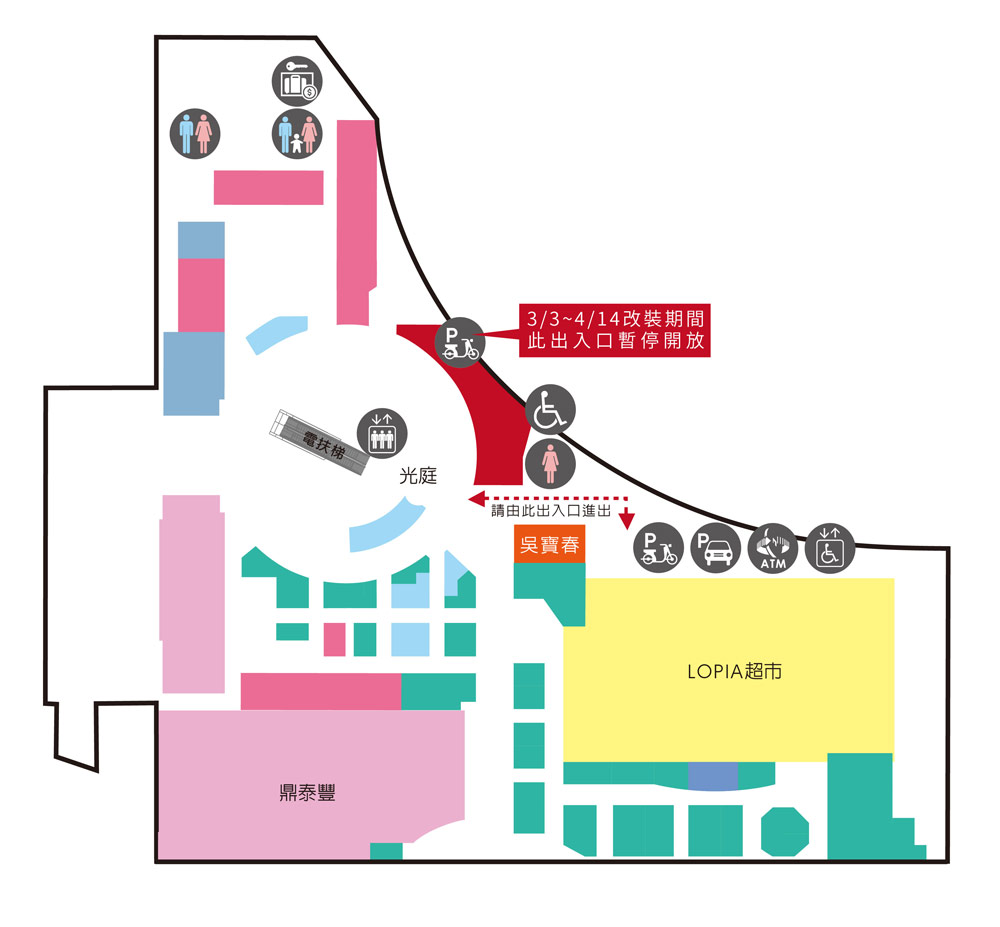如欲進入賣場及機車停車場請由吳寶春專櫃旁安全門進出。