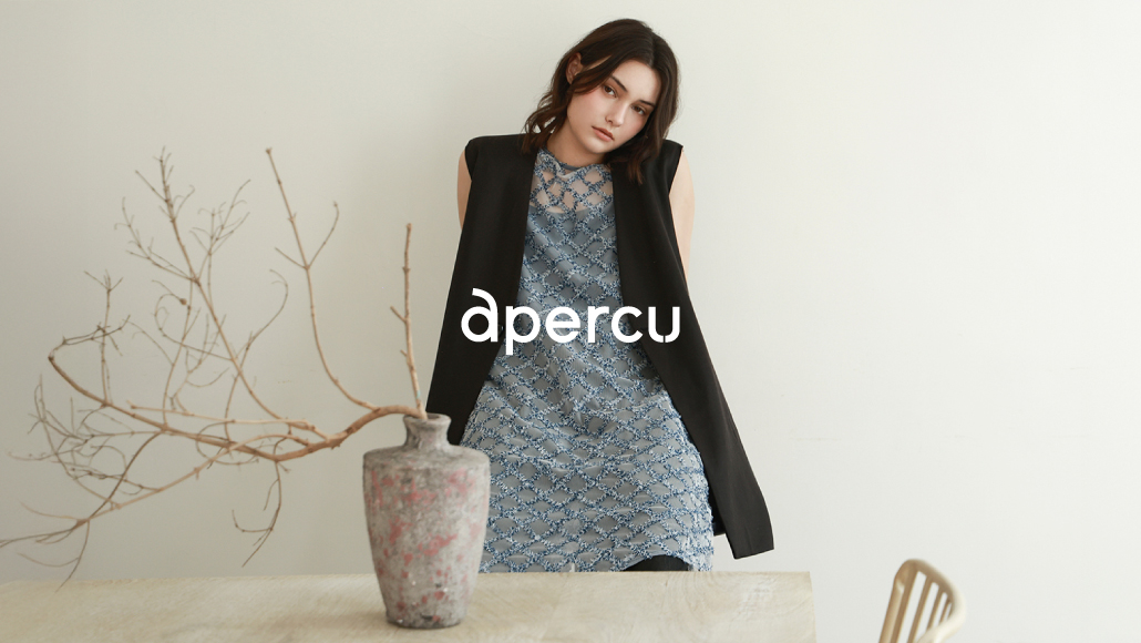 "apercu 一 詞源自法文「洞察」,設計靈感來自對生活細節、流行脈動與人文藝術的觀察。品牌持續與新銳設計師合作,將創意落實於設計、生產與實際穿著之中,讓作品從伸展台走入日常生活裡。