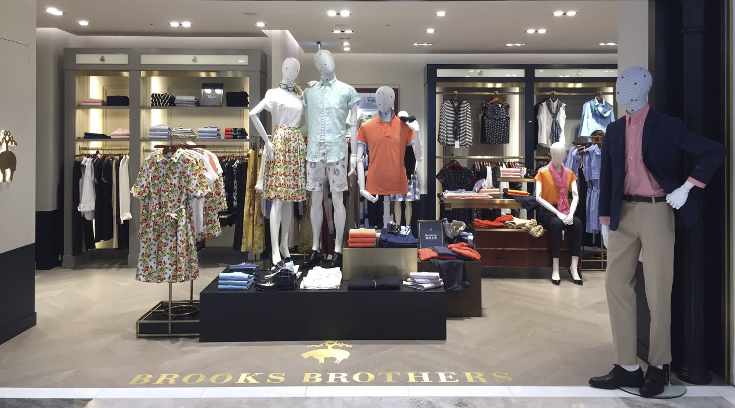 經典美式裝潢呈現品牌200周年傳承堅持。精緻的空間完美的展示了品牌最新系列,以深藍色配對比色系的淺灰色漆面以及金色層架。裝飾櫃和展示架亦採用拉絲黃銅製成。地板則採用灰色橡木作人字紋鑲嵌,與黑白色系裝飾風格地毯做搭配,營造出豪華且輕快的氛圍。