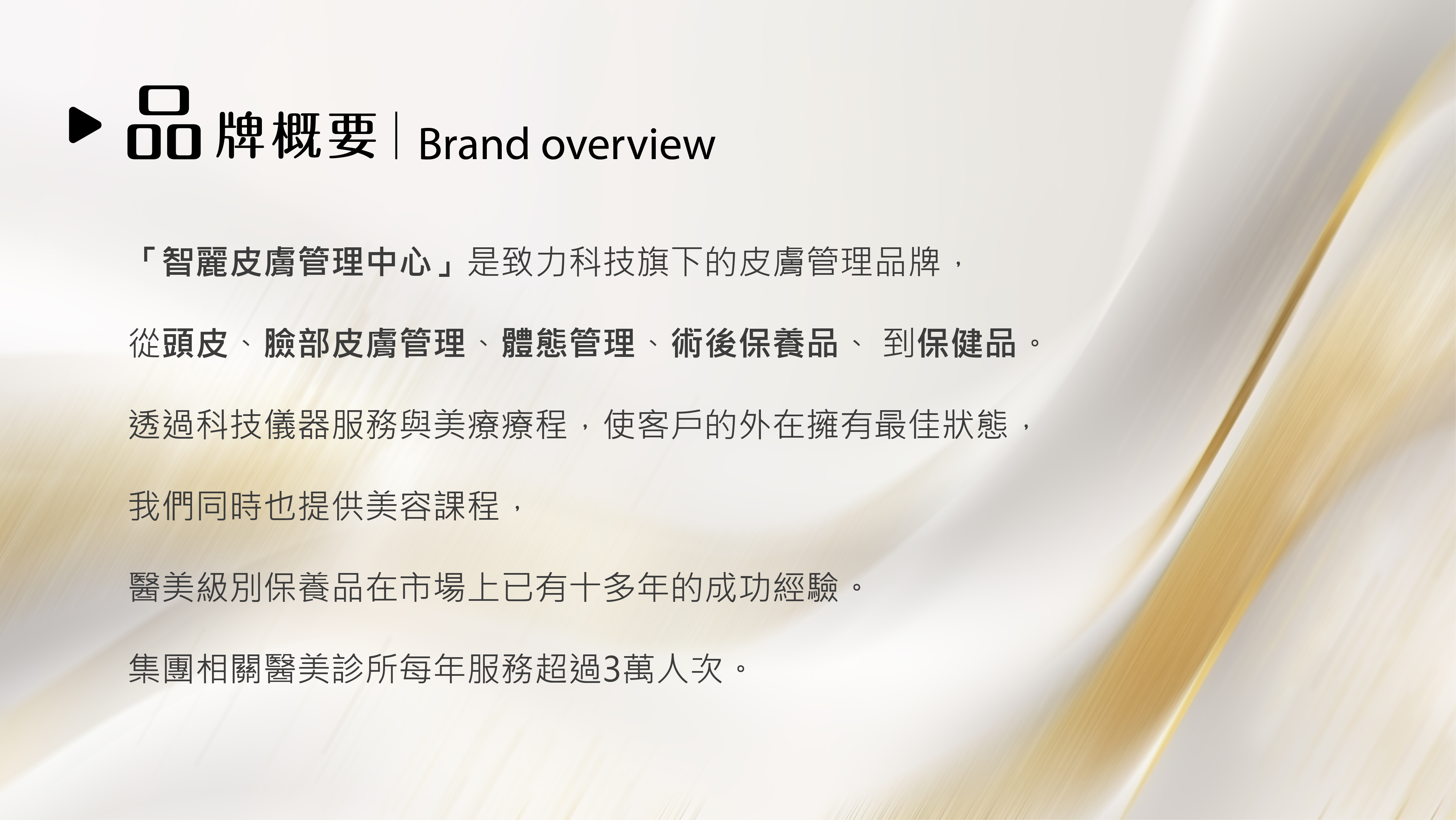 我們强調從頭皮、臉部、體態全方位外在管理的專業性,涵蓋多種皮膚管理保養需求,保障皮膚之長效保養。以及皮膚、頭皮、身體組成相關的分析儀器美容理療服務,實現品牌精神「用科技讓美麗成為簡單的事」。