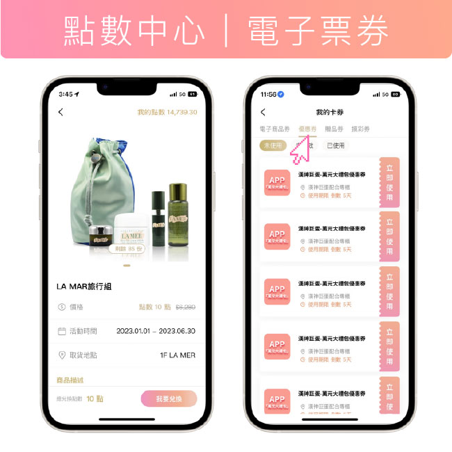 3. 持點數可在 APP 兌換優惠券 / 贈品券,重點檔期有扣點換美食及贈票活動。