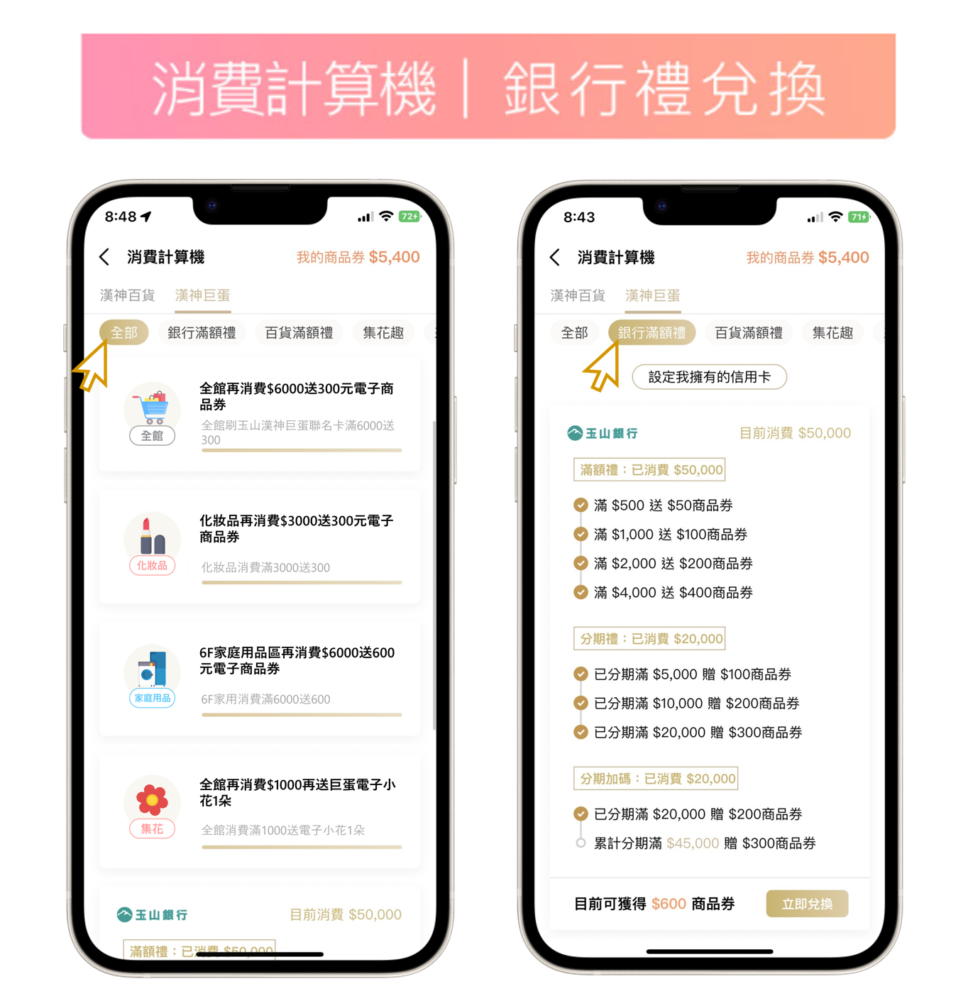 3. 以會員身份集點、刷卡消費才會呈現在顧客消費計算機 > 確認要兌換的銀行禮商品券(系統自動擇優試算)