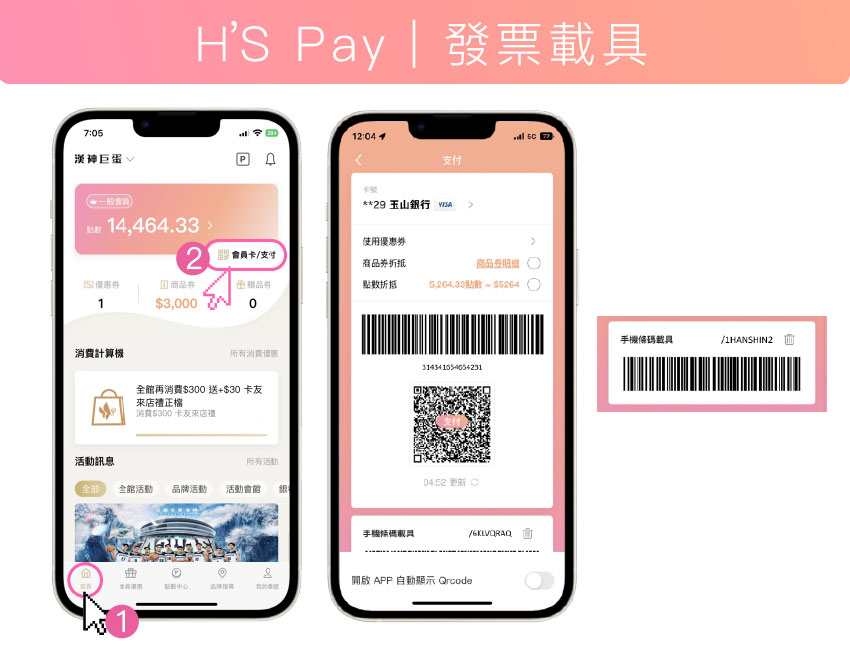1. 於漢神百貨/漢神巨蛋消費,結帳時出示 APP 會員條碼,享集點 / 折抵優惠。